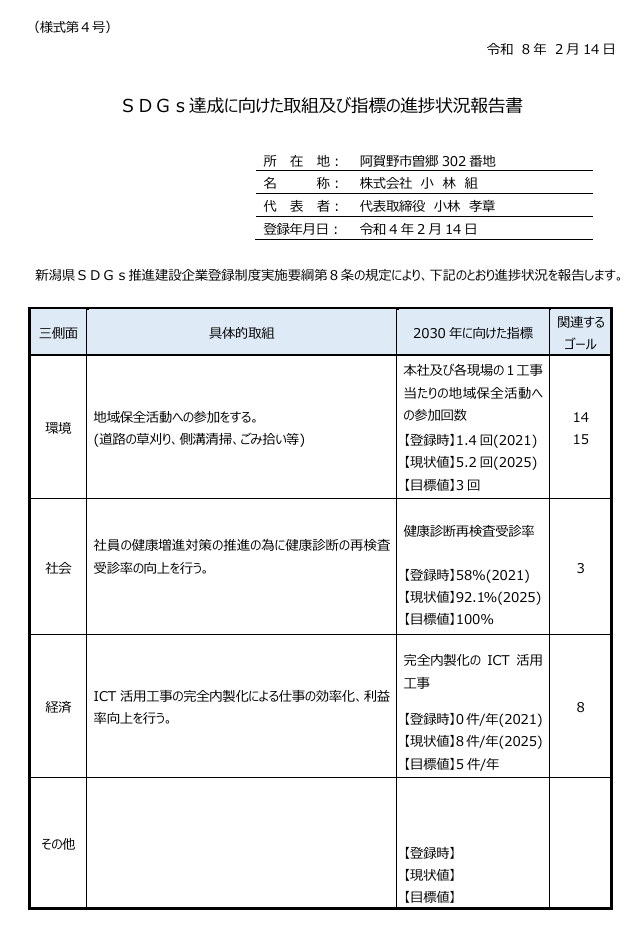 新潟県SDGs推進建設企業登録制度実施要項第8条により、下記の通り進捗状況を報告致します。